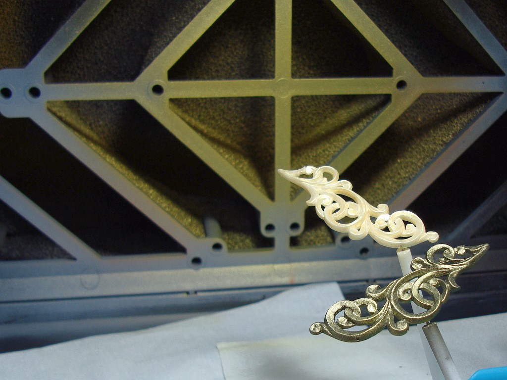 塗装、今日金色を1度だけ吹いたもの(手前)と下地レジンのまま金塗装