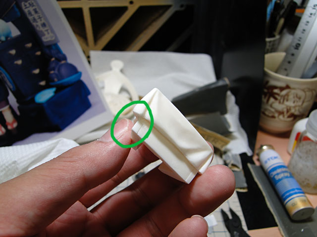 中央画像のパーツは丸で囲った箇所がレジンの湯口で埋まって