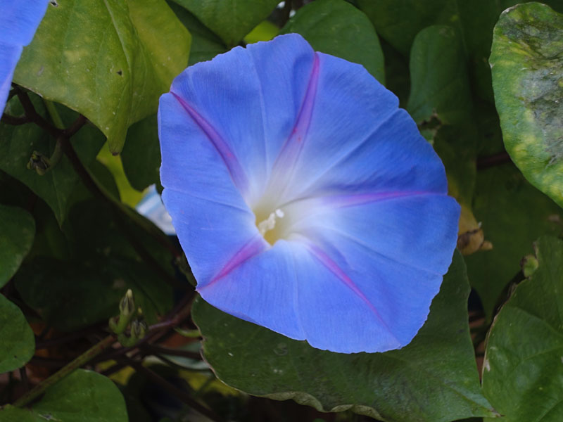 こちらがその花と蕾の様子。こういう深みのある鮮やかな蒼色のアサガオって初めて